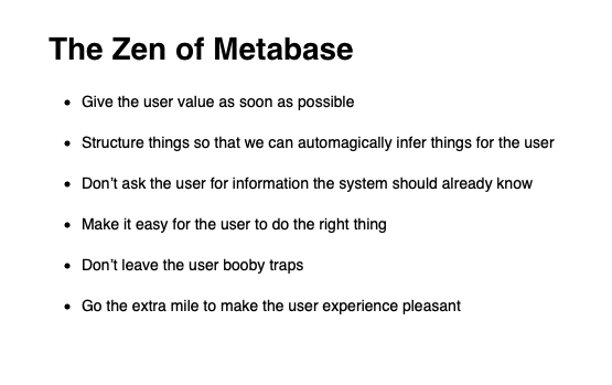 Found this in Metabase’s source, I think it’s really beautiful and inspiring! This philosophy can really be felt in the product. Keep up the good work team @metabase! 🏆 #BI #Metabase #OpenSource #Software #SoftwareDevelopment